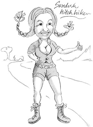 NAME: The lost Swedish Hiker REAL NAME: Svetlana SEX: Female AGE: Early Twenties BIRTH PLACE: Stockholm Sweden CHARACTERISTICS: Devastatingly beautiful, speaks little English, loves hiking but is constantly lost.