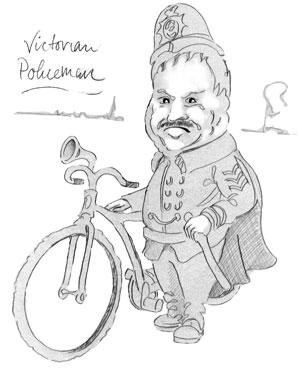 Gradually, from behind the blanket of fog, a shape appeared. As it drew closer, Katie made out a large man riding what seemed to be a very old bicycle, its rusty pedals squeaking as they went around and around. He was moving so slowly that he was in danger of tipping over at any moment. Every couple of feet, he would wobble even more and almost fall completely over, which explained the brief pauses in the squeaking. Eventually, he got close enough for her to see that he was a middle-aged, overly large man in an old-fashioned police uniform with sergeant's stripes on the arms. He was wearing a helmet that looked about two sizes too small that was balanced precariously on top of his large, egg-shaped head, barely held in place by a thin chin strap. He reminded her of one of those old English bobbies from Victorian times.